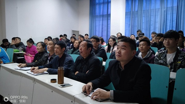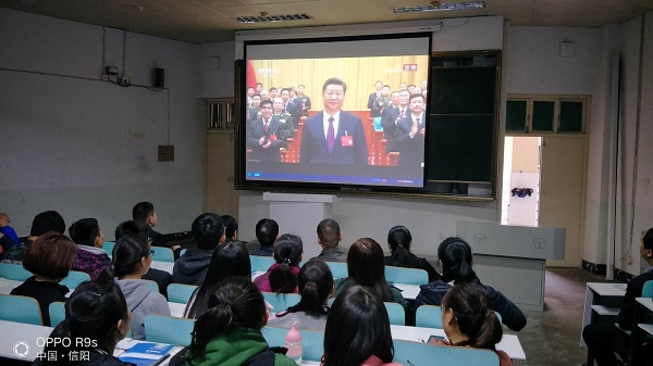 10月18日上午9:00,WilliamHill中文官方网站党委书记陈青、院长余道明带领该时段没有课的教师、学生90余人在文科楼109观看了十九大开幕会。