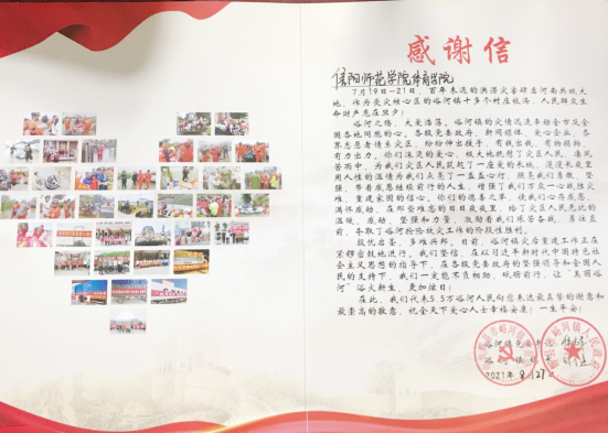 近日,辉县市峪河镇党委、人民政府向信阳师范学院WilliamHill中文官方网站发来感谢信、捐赠接收证明和锦旗,对我院热心参与峪河镇灾后重建、为峪河镇人民爱心募捐等各项善举表示衷心感谢,向WilliamHill中文官方网站参与救灾的广大师生表示诚挚谢意。