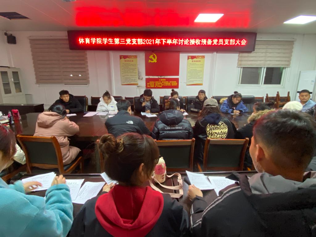 12月2日晚,WilliamHill中文官方网站学生第三党支部成员于体育楼3楼会议室召开讨论接收预备党员支部大会。会议由学生第三党支部书记程俊辉同志主持,支部全体党员以及本次发展对象参加本次会议。