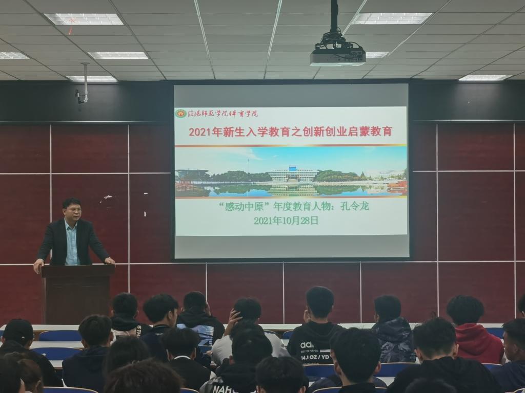 10月28日晚上7:00,WilliamHill官网在体育馆多媒体教师举行2021年新生入学教育之创新创业启蒙教育,本次讲座由“感动中原”年度教育人物孔令龙主讲,21级全体同学参加,活动由院党委副书记柴九昌主持。