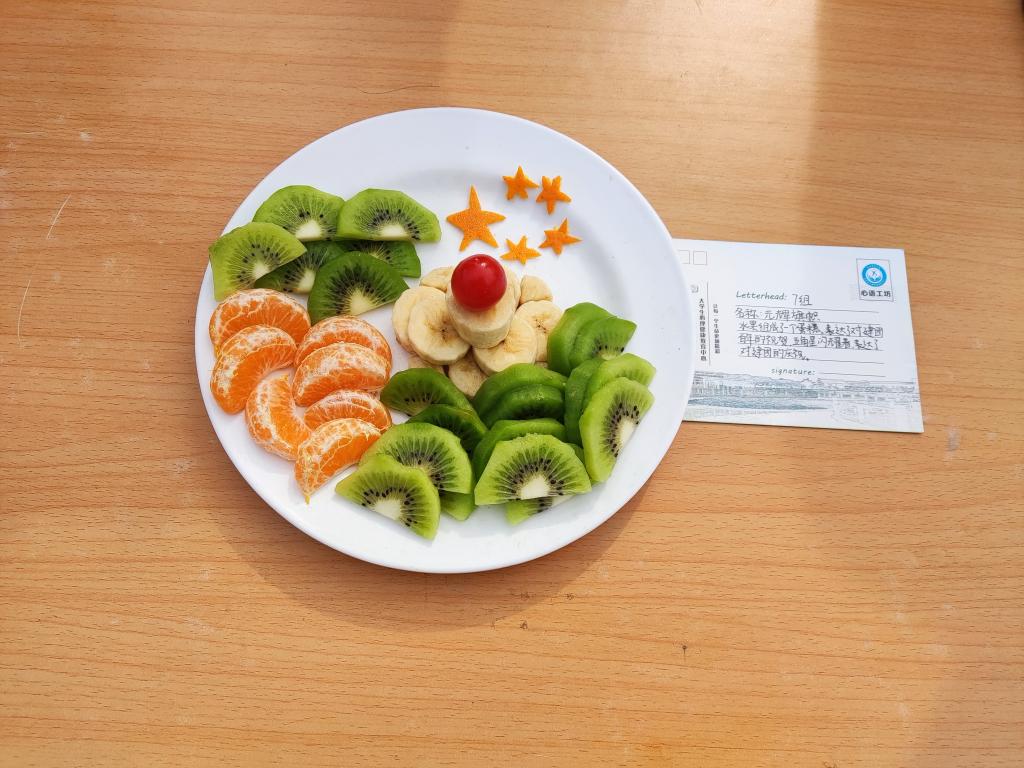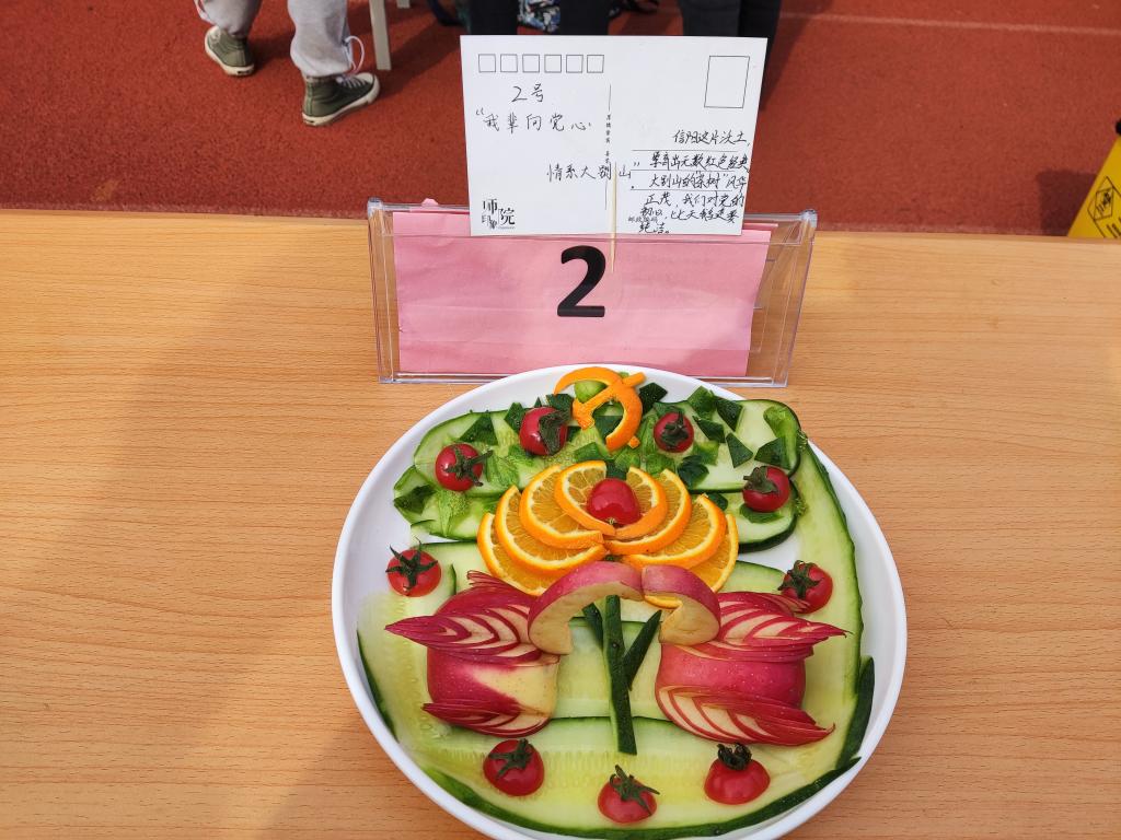 活动开始前参赛选手自由组队成四人队伍,随后每队选手充分发挥动手创新能力,分工明确,互相配合,对准备的水果削皮、切块、雕刻......同时对其进行摆盘,成品在同学们的手下逐渐成形。完成后各队向评委展示作品、讲解寓意,“橙心橙意 墩墩庆周年”、“我辈心向党 情系大别山”、“光辉旗帜”等一个个作品表明青年学生们的追寻信仰之光,勇担青春使命的决心。活动结束后评选出一等奖两队,二等奖三队,三等奖五队,优秀奖十队,并为每队发放奖品。