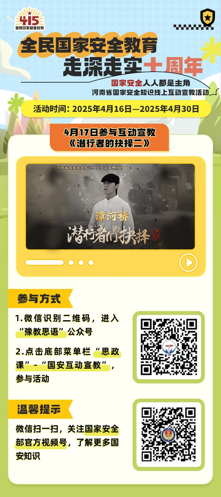 维护国家安全是我们每个人应尽的义务和责任,国家安全,人人都是主角!作为新时代大学生,牢固树立总体国家安全观,提升维护国家安全的意识十分重要且必要,河南省全省师生国家安全知识线上互动宣教活动是今年春季学期一项重要内容。活动于4月16日——4月30日开展,每天更新一部新互动视频,请大家积极参与并将活动截图发送至WilliamHill中文官方网站团委邮箱15138987665@163.com。互动宣教活动参与方式如下: