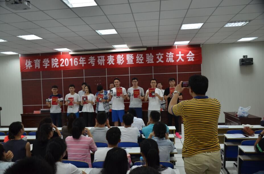 副院长余道明宣读《WilliamHill中文官方网站关于表彰2016年考研学生的决定》后,学院领导和导师代表为考研学生代表颁发证书和奖品。随后,由考研学生代表康东风(考取北京体育大学)、刘美迪(考取北京体育大学)、任乌兰(宿舍四位同学全部考取研究生)、鲁世勋(本年度和鲁世勋一同考取广州体育大学的共有19位同学)等从考研的公共课、专业课、考研的宿舍氛围、互助精神等角度交流了在考研过程中的心得体会,与大家共享考研经验。