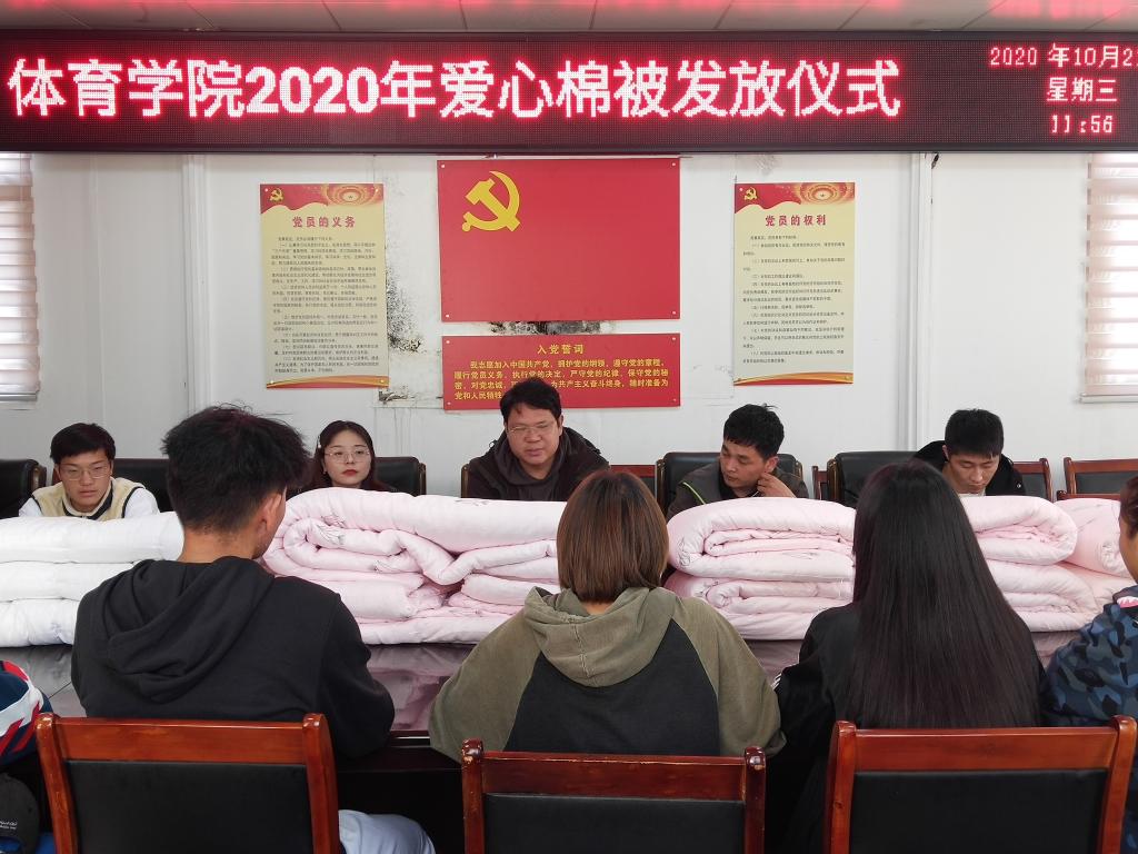 10月21日中午,WilliamHill官网在体育楼三楼会议室举行“WilliamHill中文官方网站2020年爱心棉被发放仪式”。出席本次会议的有WilliamHill中文官方网站副处级辅导员柴九昌,辅导员程俊辉、赖梦玥及各班学生代表参会,仪式由柴九昌主持。