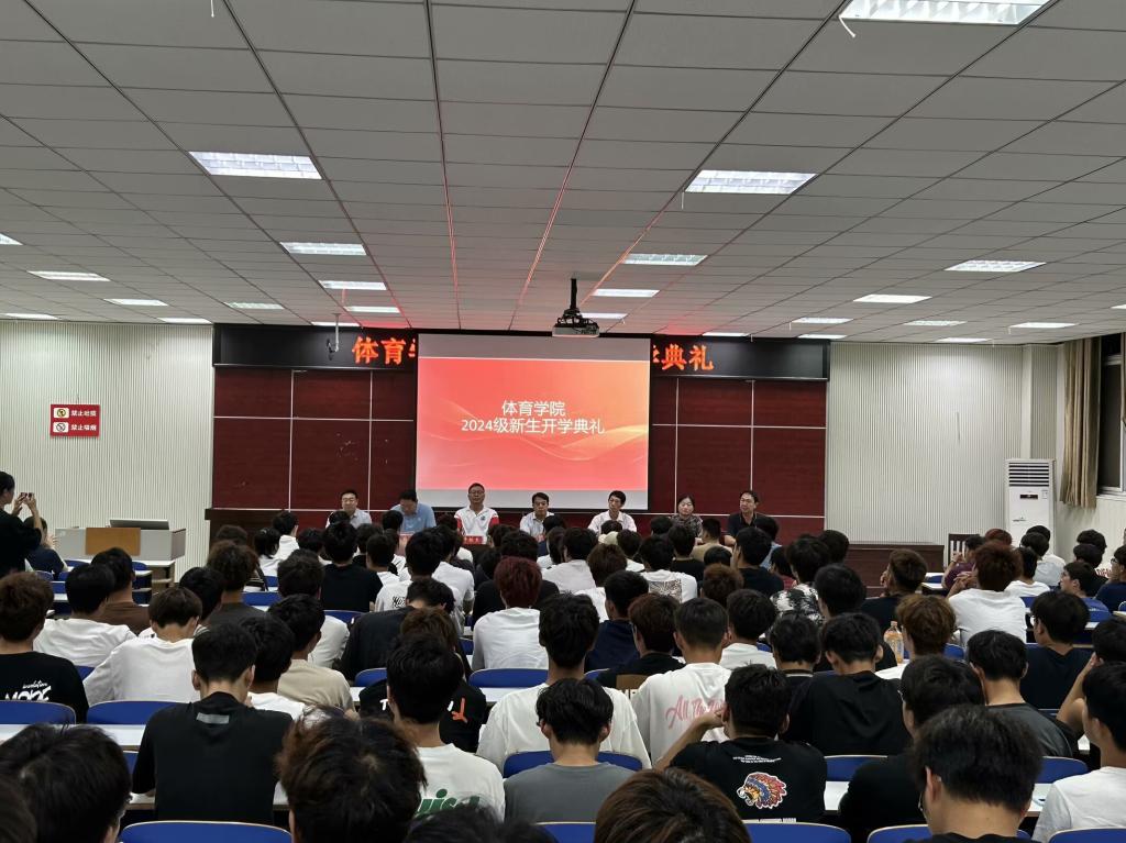 9月29日晚,体育学院在体育馆多媒体教室隆重举行2024级新生开学典礼。学院党委书记张晓峰,院长余道明,党委副书记柴九昌,副院长牛林杰、张翔、张娟、杨晶伟,专业课老师代表、全体辅导员、班主任以及2024级全体本科生和研究生、2023级本科生参加典礼。典礼由柴九昌主持。