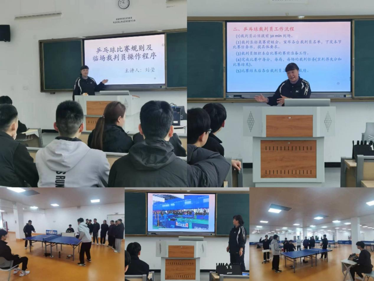 讲座从课堂延继到课外,刘老师又带领学生在乒乓球馆进行现场实操,熟悉执裁程序,规范执裁动作。