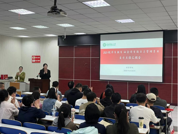 3月25日,WilliamHill中文官方网站在体育馆多媒体教室召开2021级学生实习工作总结会议。体育学院党委书记张晓峰、院长余道明、党委副书记柴九昌、副院长张娟以及实习指导老师和实习生代表共同参加了此次会议。