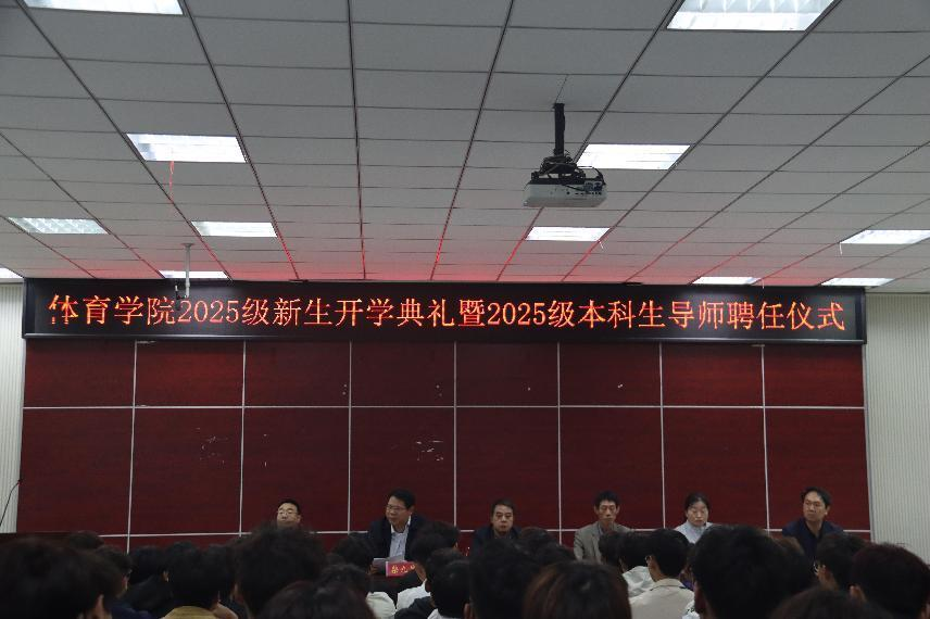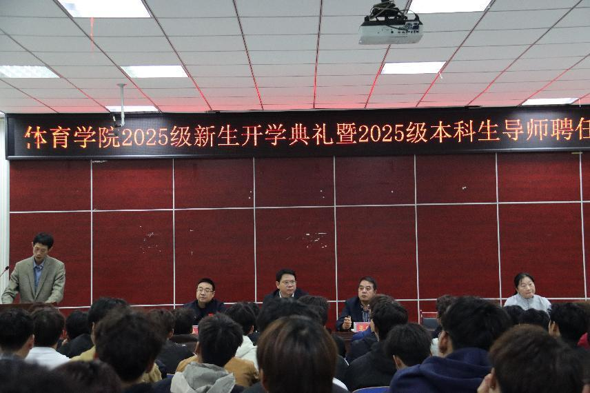 2025年10月9日,WilliamHill中文官方网站在体育馆多媒体教室举行2025级新生开学典礼暨2025级本科生导师聘任仪式。WilliamHill中文官方网站党委书记张晓峰、院长余道明、党委副书记柴九昌、副院长张娟、张翔、杨晶伟,全体科级干部、辅导员,2025级体育教育专业本科生导师以及2025级体育教育专业本科生、2025级研究生参加了此次会议,会议由柴九昌主持。