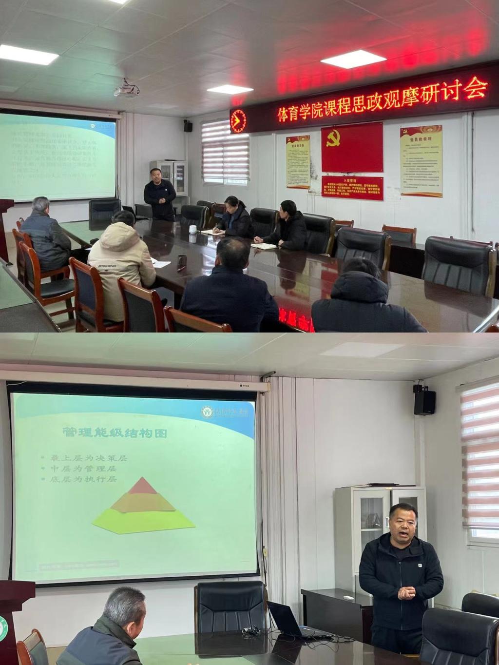 会议开始,马峰老师结合自己的观点向各位老师说明“管理能级结构图”,总共分为三层,并一一对应解释以及适当补充;随后,冯玉龙老师则是遵循“奥林匹克文化”的特点,向各位老师讲述在课堂教学中向学生渗透爱国主义情怀,进而增加学生的民族自豪感。最后,余院长结合两位老师所说的给予了充分的肯定和表扬,同时也指出了一些不足。